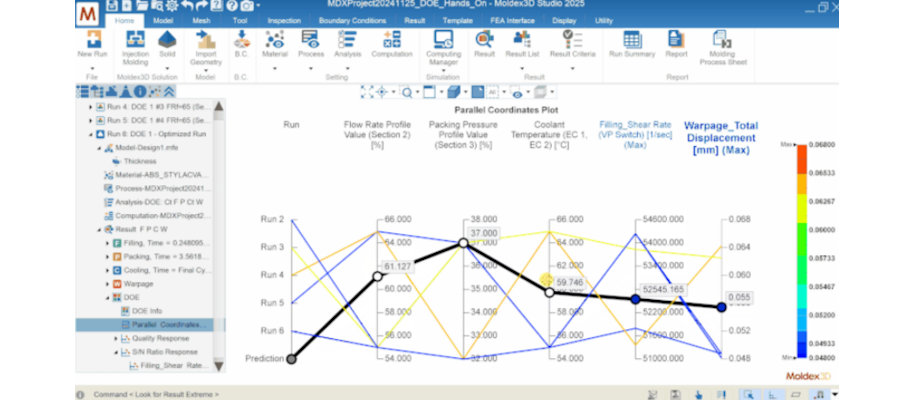 A Moldex3D 2025 DOE modulja új szintre emeli a kísérlettervezést azáltal, hogy interaktív és valós idejű predikciós funkciókat kínál. A felhasználók gyorsan összeállíthatják a vizsgálati paramétereket, majd az AI-alapú predikció azonnal megmutatja, hogyan hatnak ezek a beállítások a termék minőségére és a gyártási folyamat stabilitására. Ez lehetővé teszi a legjobb kombinációk kiválasztását anélkül, hogy minden variációt külön szimulálni kellene. Az eredmény: jelentős időmegtakarítás, csökkentett költségek és optimalizált gyártási folyamat, miközben a döntéshozatal sokkal adatvezéreltebb és megbízhatóbb.